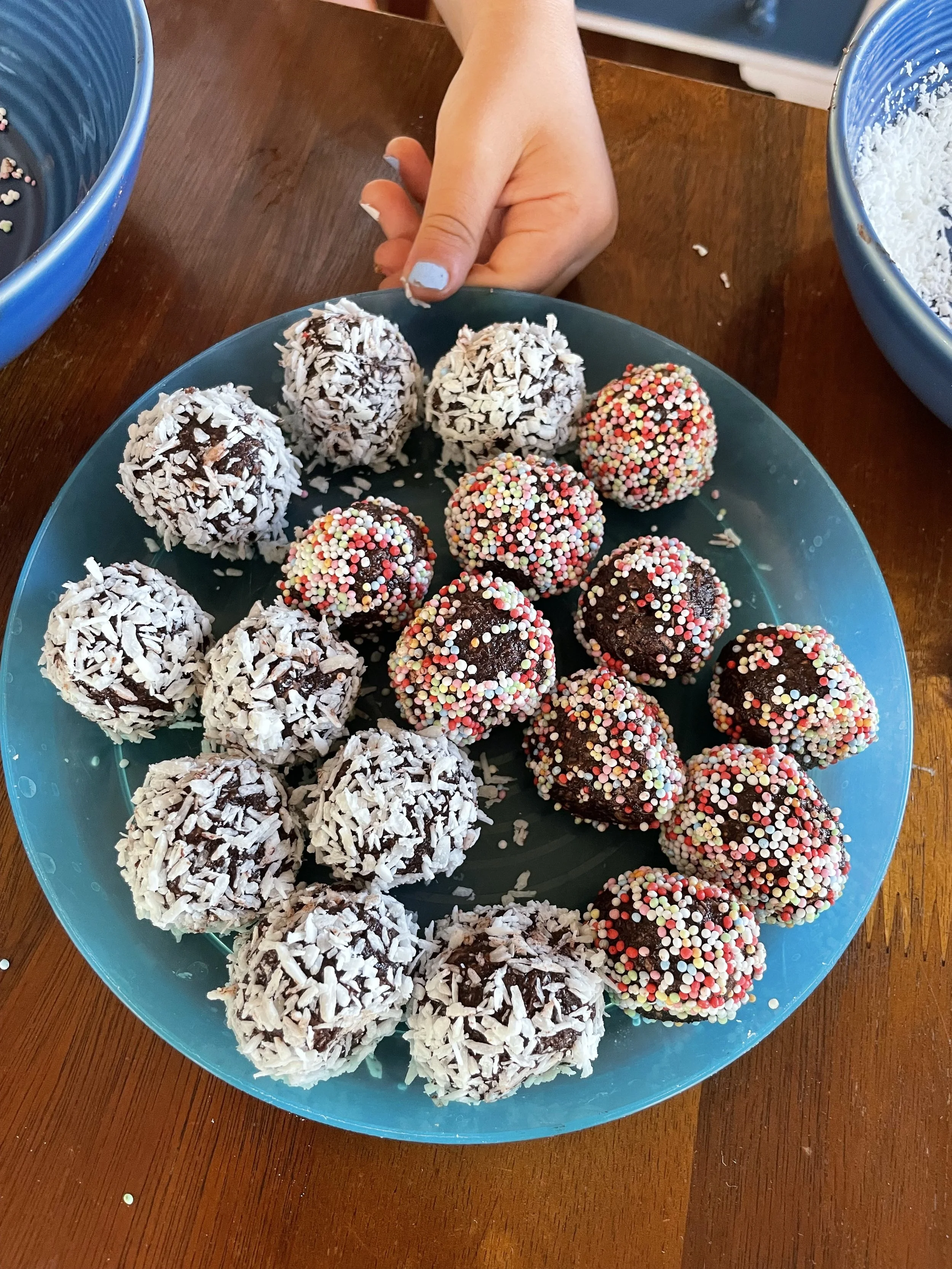 Just mix all ingredients together until well combined. Roll into little balls and then roll them in desiccated coconut and/or sprinkles. You can also roll the balls in chopped hazelnuts or almonds.