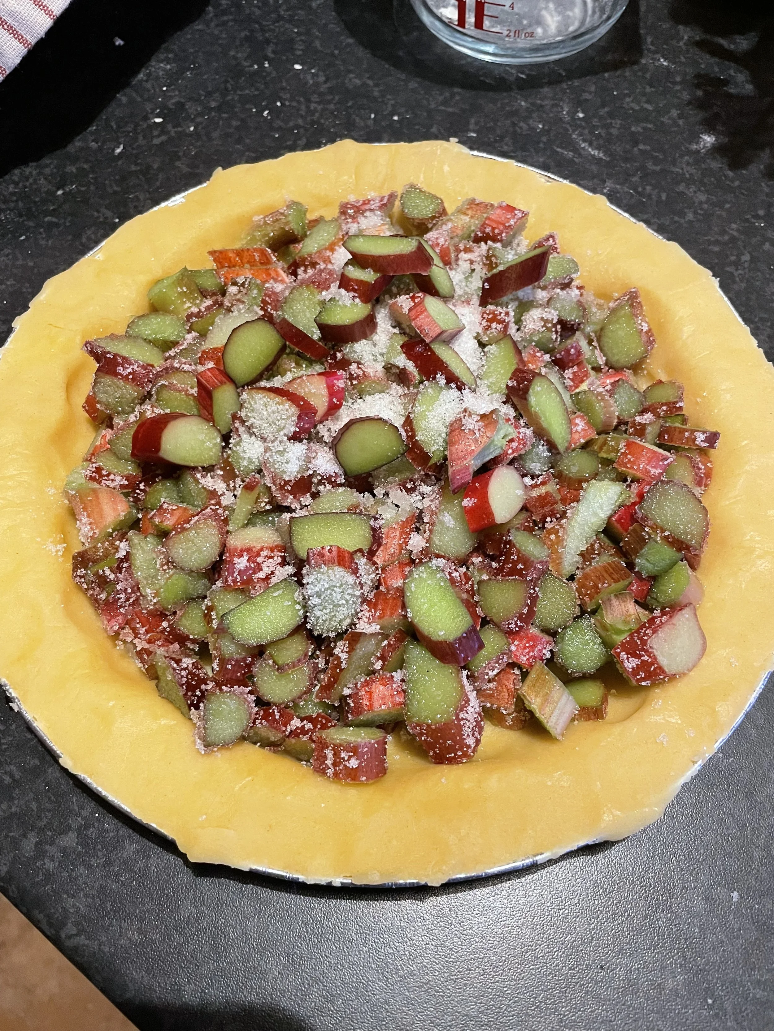 Place it in the bottom of the tart dish. Add the rhubarb and sugar mixture.