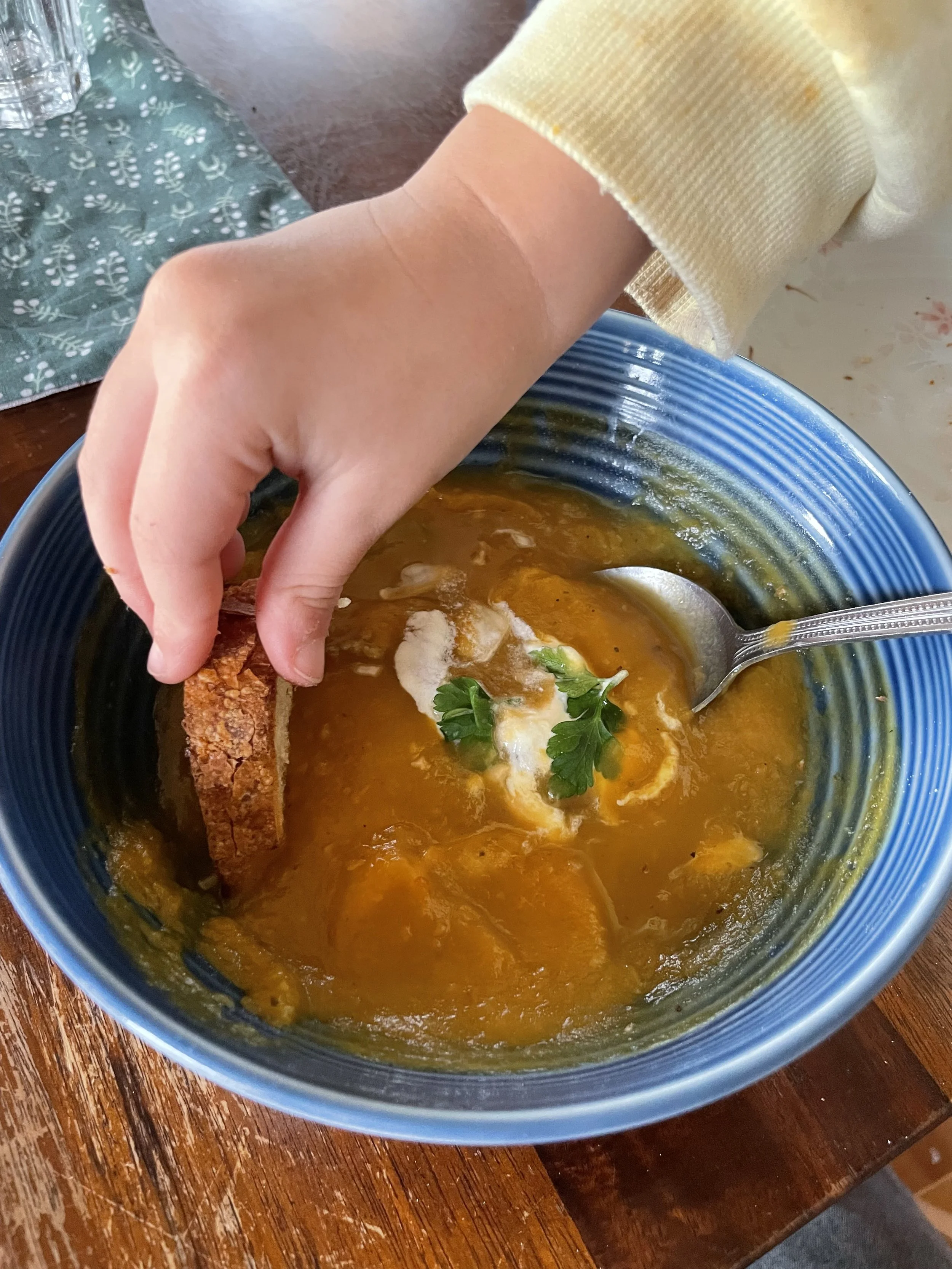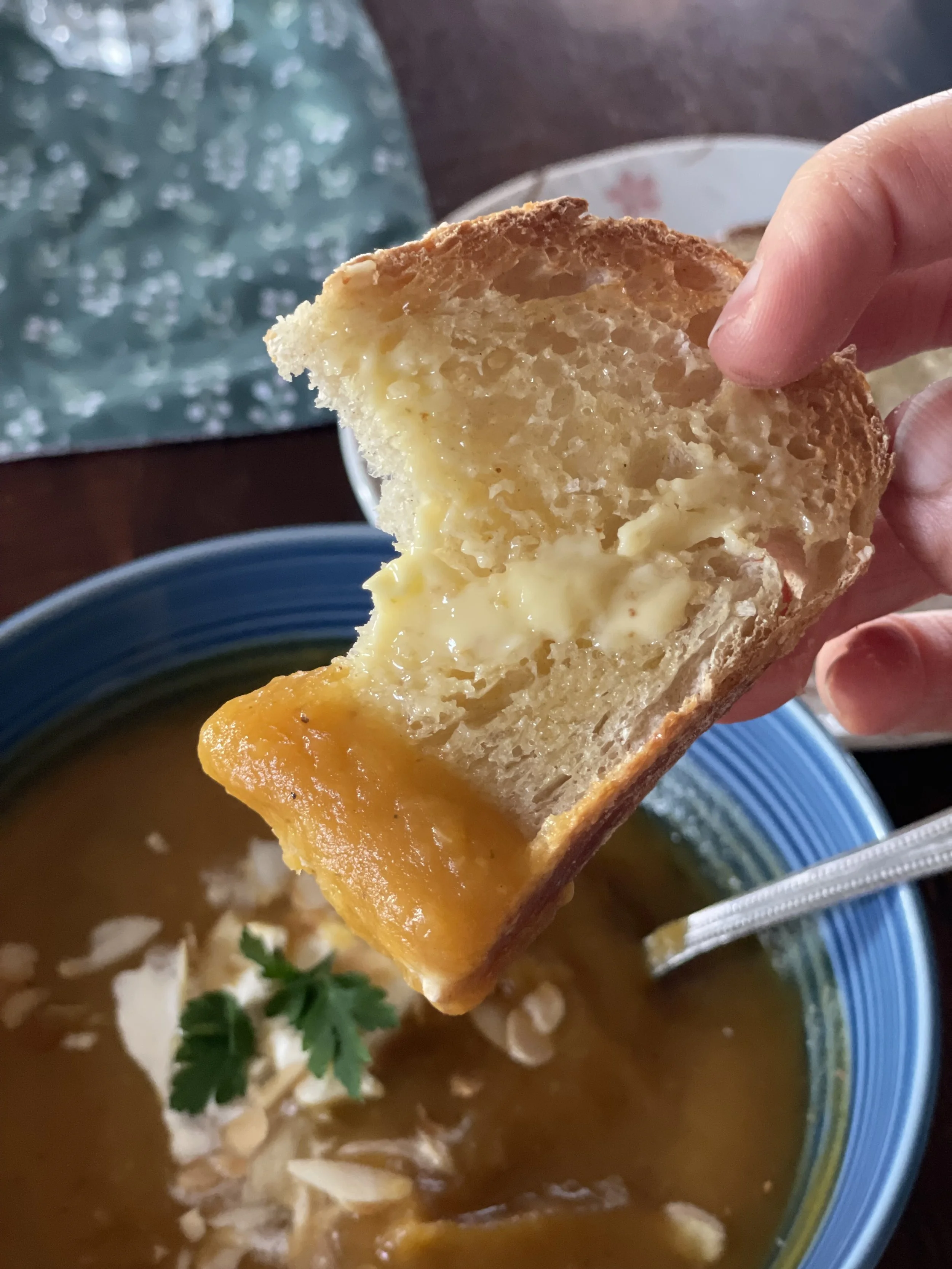 I like to top the soup with some crème fraiche and toasted almonds, but there’s absolutely no need for this.